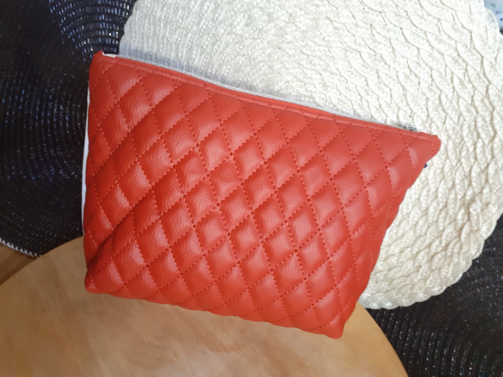 Pochette matelassée rouge : élégante et texturée, idéale comme trousse à maquillage ou pochette de sac.
