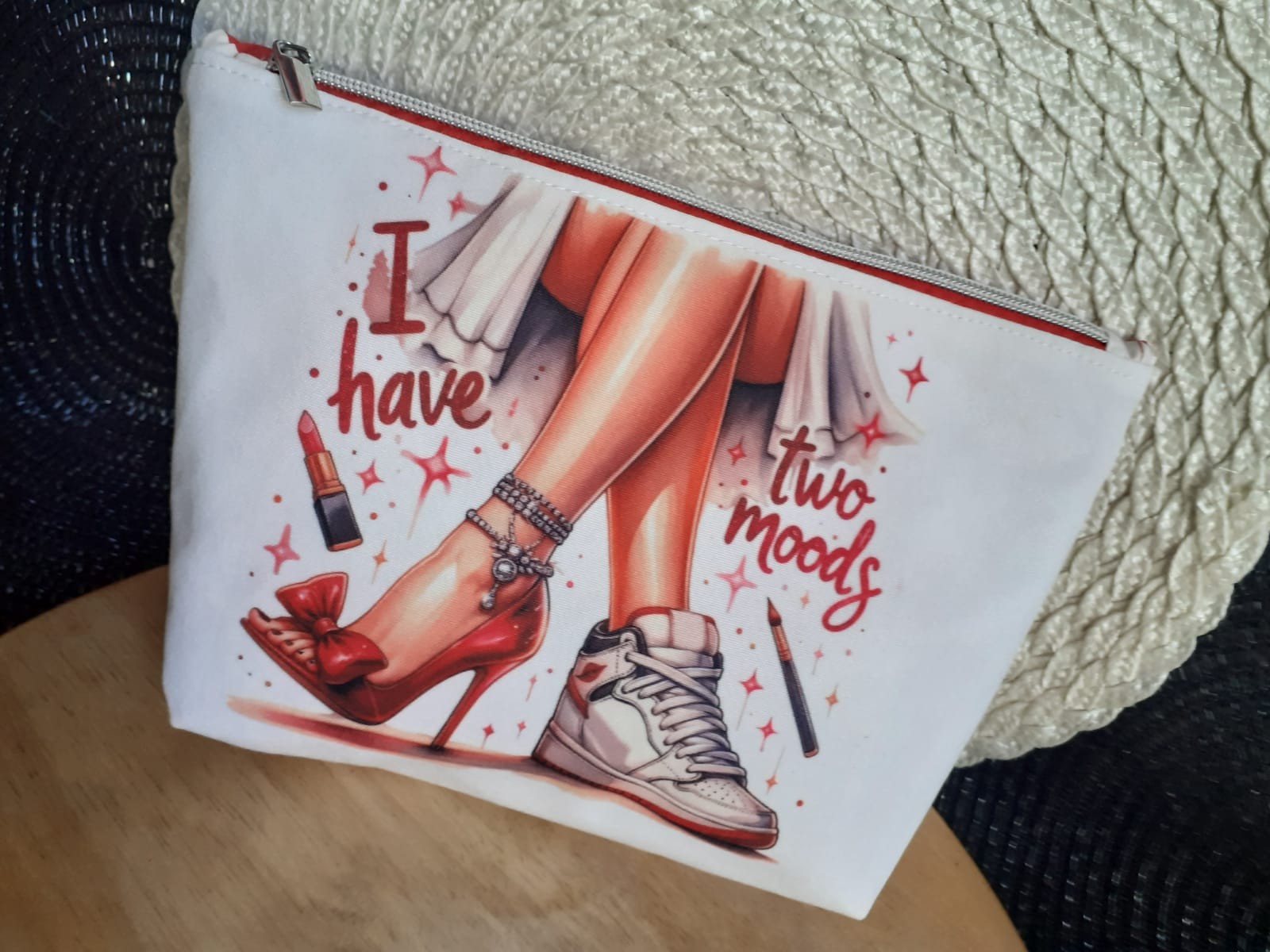 Pochette illustrée “I have two moods” : humour et contraste entre glamour et casual, parfaite pour ranger stylos, maquillage ou petits essentiels avec une touche pop.